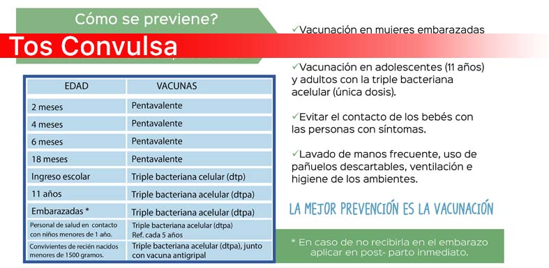 Para prevenir la tos convulsa, el calendario oficial prevé la aplicación en forma gratuita y obligatoria de cuatro vacunas: la pentavalente, que se aplica a los 2, 4 y 6 meses; la cuádruple, a los 18 meses; la triple bacteriana celular, al ingreso escolar; y la triple bacteriana acelular, que se aplica a los 11 años.