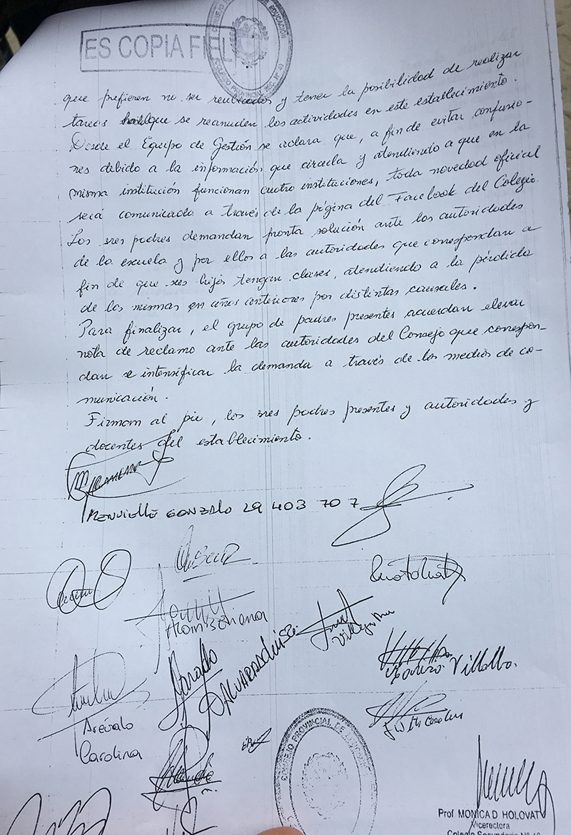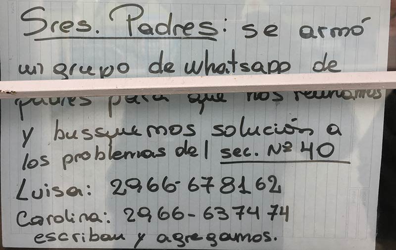 Para finalizar el padre quien tomo la palabra agrego “estamos cansado de mentiras y excusas, vamos a llevar este reclamo a todos los medios y dependencias del estado que tengan que ver con este problema, sentimos que se nos ignora y al mismo tiempo le quitan a nuestros hijos el derecho a la educación. Sabemos que muchos padres no están al tanto de lo actuado esta tarde y por eso hemos dejado en la puerta de establecimiento los datos para que se pongan en contacto con nosotros y de esa manera sumar voces a este reclamo.