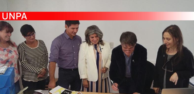 La firma de convenio se llevó a cabo en Rectorado, durante una breve reunión en la que también estuvieron presentes las decanas de las Unidades Académicas Caleta Olivia, Ing. Eugenia de San Pedro y San Julián, Prof. Roxana Puebla y la secretaria de Ciencia y Tecnología de la UNPA, Dra. Sandra Casas.