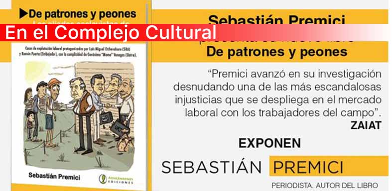 Este jueves 10 de noviembre, a las 19:00 hs., en el Salón Auditorio del Complejo Cultural Santa Cruz, el periodista Sebastián Premici, presentará su libro "De patrones y peones". En la oportunidad, participarán como panelistas el ex Titular de RENATEA Santa Cruz, Daniel Lier, y el reconocido historiador local, Miguel Ángel Auzoberría.