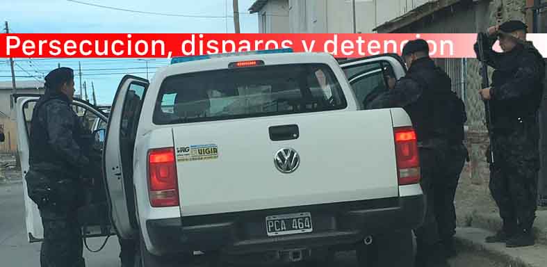 Luego de que fuera librado un pedido de detención de un individuo involucrado en hechos de robo, sucedidos esta mañana, personal policial es alertado de la ubicación del sujeto en proximidades de la calle caseros al 500, al llegar los efectivos al lugar, comienza la persecución producto de la fuga en un vehiculo Ford 4000 con dos masculinos a bordo, los que en distintas ocasiones intentaron colisionar los móviles policiales por lo que los efectivos realizaron disparos preventivos a fin de que los presuntos delincuentes depusieran su accionar, que para esas instancias ya se encontraban interviniendo personal de infantería quienes logran detener a los sujetos en calle Alfredo Nobel al 2400