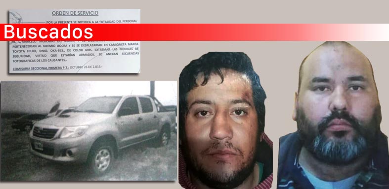 Es así que en las primeras horas de la mañana se emitió una orden de servicio en la que se daba a conocer los datos de los presuntos autores identificados como Marcelo Mercado alias Machi y Diego Javier Paz vinculados en ambos casos a la Union Obreros de la Construcción de la República Argentina (UOCRA) los cuales se estarían movilizando en un rodado Marca Toyota Hilux Dominio OKA-892 y se informaba a todos los agentes policiales extremar las medidas de precaución ya que se encontrarian armados.-