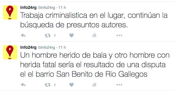 Cerca de las 03:20 de la madrugada de hoy fuentes policiales informaron a Info24rg.com, que en en inmediaciones del barrio San Benito y producto de una disputa se habian producido disparos de arma de fuego por parte de dos individuos quienes se habrían dado a la fuga en un rodado que hasta el momento se desconocian los datos identificatorios. con el transcurso de las horas y por declaraciones de uno de los heridos que fueran asistidos en el hospital regional de Río Gallegos, es que se pudo obtener mayor información acerca de los autores del hecho en el cual perdiera la vida una persona que hasta el momento no había sido identificada.-