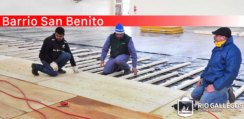 La obra en el gimnasio del Barrio San Benito se inició el pasado viernes con la colocación de una pintura asfáltica en la carpeta del gimnasio para posteriormente continuar con la colocación de un nylón antihumedad y del entramado fenólico. En tanto, inició hoy la colocación del piso de madera flotante.