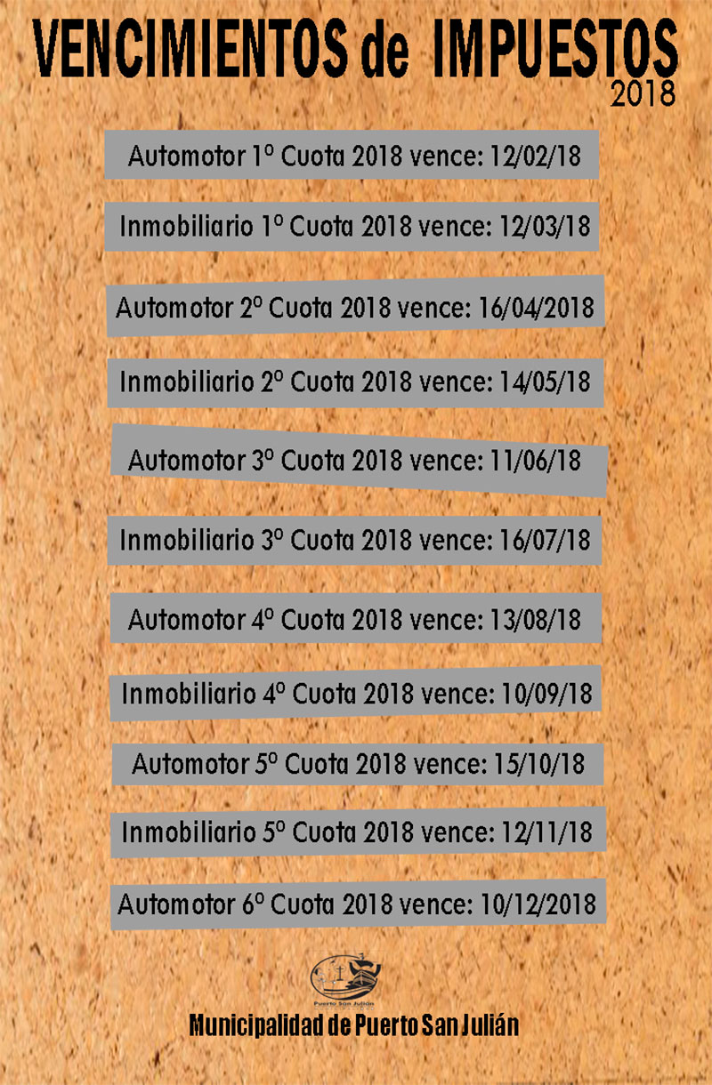 La Municipalidad de Puerto San Julián Recuerda a la comunidad que el impuesto a inmuebles, ya se encuentra habilitado para abonar, recibiendo el mismo un descuento del 10% si es abonado en totalidad antes del 12 de marzo 2018. Ver Calendario Impositivo