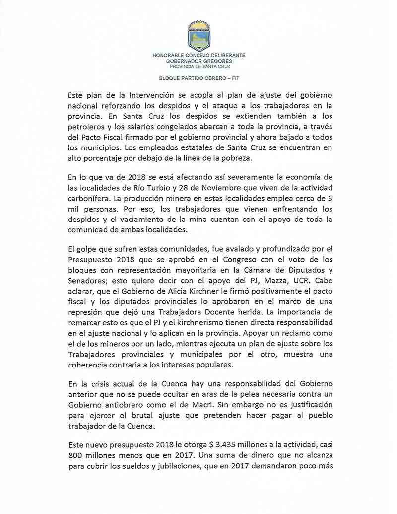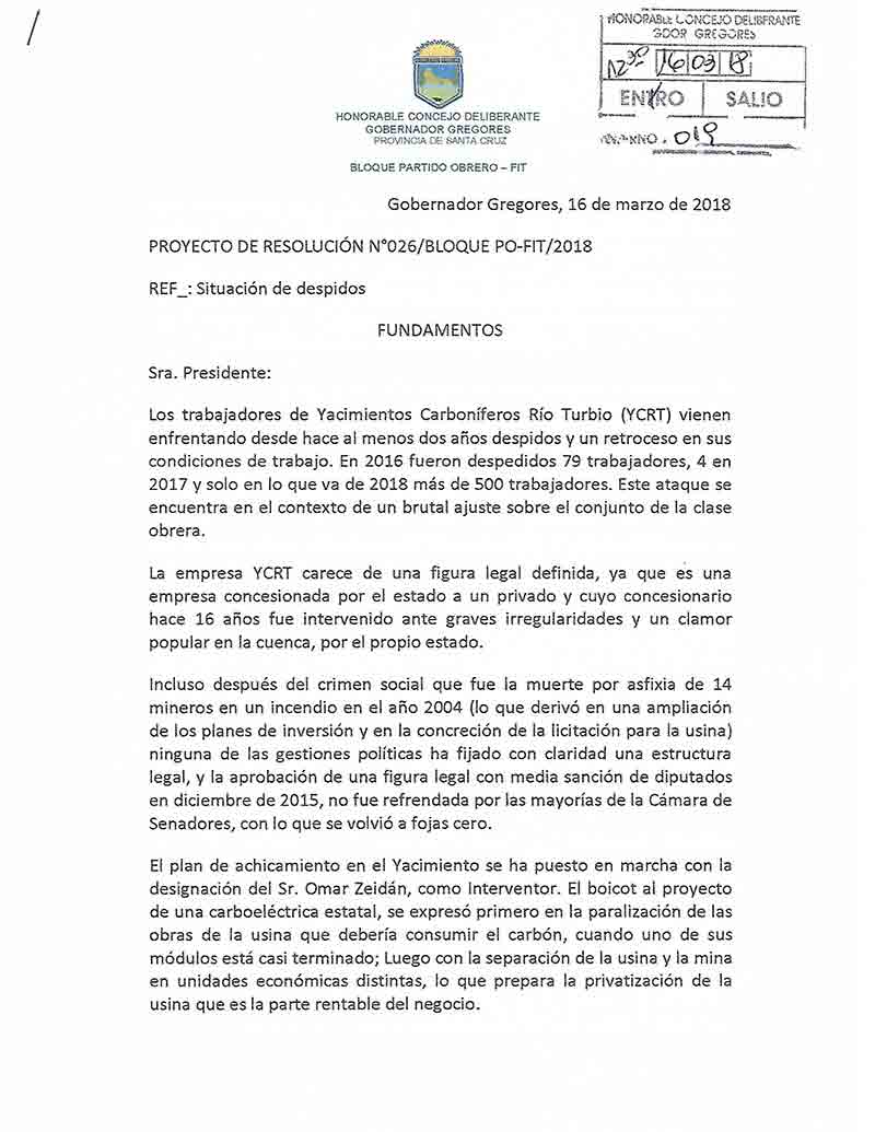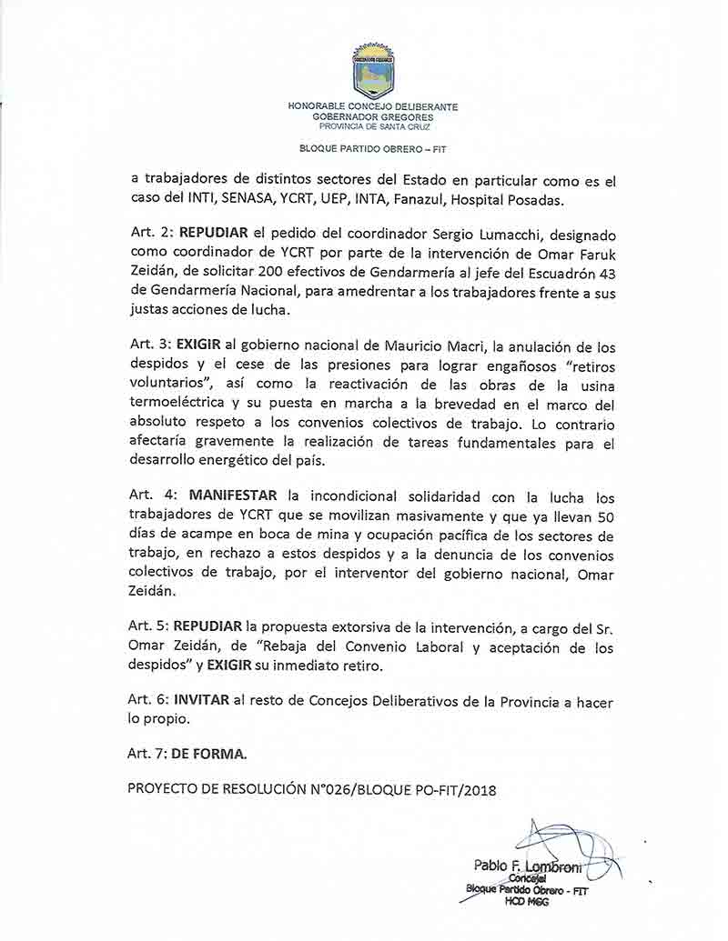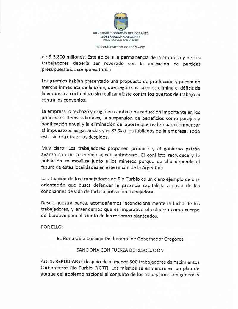 En el día de la fecha los Concejales del Partido Obrero de Gobernador Gregores y Perito Moreno, Pablo Lombroni y Damián Pessolano respectivamente, han presentado en los Concejos de dichas localidades, el Proyecto de resolución en defensa de los Trabajadores de YCRT, del emprendimiento minero y la Termo Usina, denunciando y exigiendo el cese a los despidos en todo el país, la reactivación de los Proyectos en la Cuenca como columna vertebral del desarrollo de las localidades de Río Turbio y 28 de Noviembre, el pedido de reincorporación a todos los despedidos, y el freno a un ajuste brutal; donde caracterizan que la situación de La Cuenca es la antesala a lo que le sucederá al resto de los trabajadores Provinciales y Municipales de Santa Cruz, como un plan pactado entre Macri y el Kirchnerismo, y que solo la UNIDAD DE LOS TRABAJADORES será la herramienta que posibilite frenar tal cometido. Dicho proyecto ya fue alcanzado a los Obreros de YCRT, como muestra del acompañamiento a su valiente lucha, y tal gesto pretende hacer llegar el acompañamiento de dos comunidades en relación a la actividad minera, y el mensaje de que, si los obreros de YCRT son derrotados, todos los trabajadores de Santa Cruz habremos perdido, remarcando la importancia fundamental que implica la UNIDAD DE UNA CLASE.