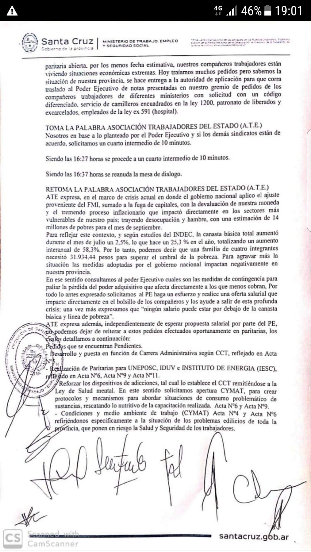Si bien entendemos el contexto y analizando lo expresado por el Poder Ejecutivo que propone una paritaria para el mes de diciembre dejamos en claro y firmado en Acta que nos parece muy prolongado el plazo para continuar con la paritaria, ya que las familias de nuestros compañeros y compañeras ya no tienen que comer, no pueden llevar el pan a la mesa los 30 días del mes.